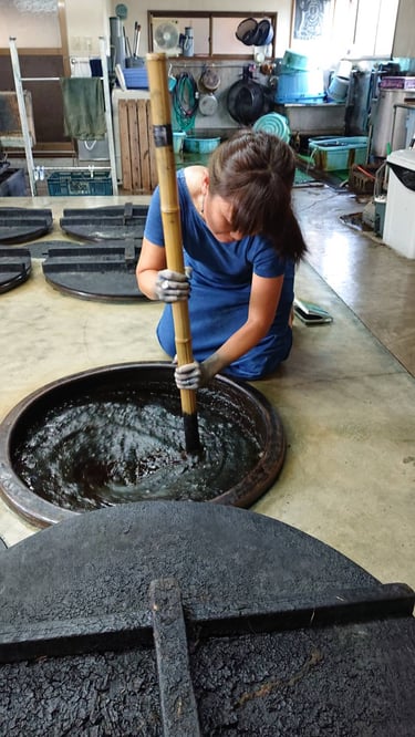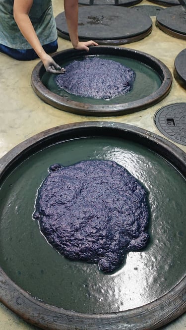 Emi is trained as a Japanese Sukumo Indigo Dyer by Ransyu, 藍秀 in Tokushima, Japan in 2022. This ancient practice involves creating fermenting the indigo leaves for more than 100 days before extracting the colour by sukumo maker called “Ai-shi” and more than 12 days to create the indigo vat by Sukumo dyer called “Aizome-shi”.