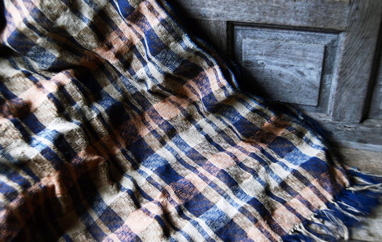 Emi created a large silk blanket, hand-dyed with organic indigo, local willow leaves, and walnut. Commissioned by a fashion label in England and China, the piece reflects her skill in natural dyeing.