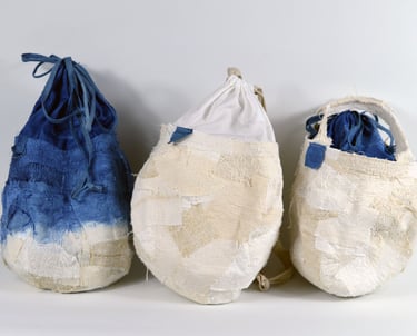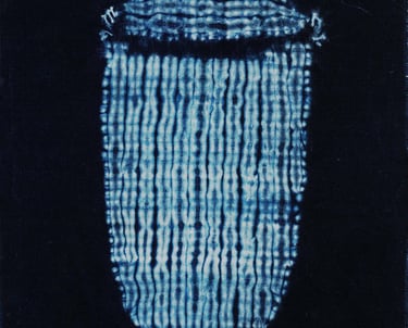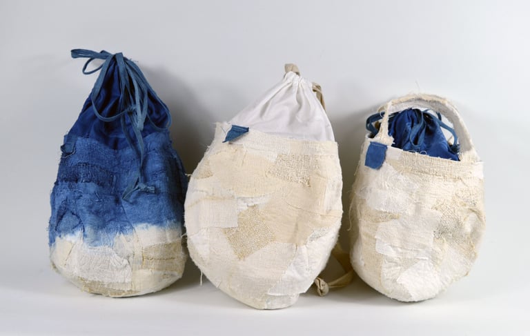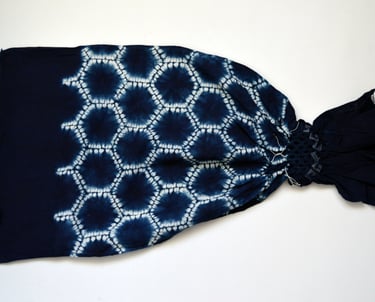 Emi works with the traditional Japanese technique of shibori tie-dye, using indigo vats. She hand-stitches fabric with sashiko needles to create intricate shapes and patterns, gathering the material tightly before dyeing it in indigo.
